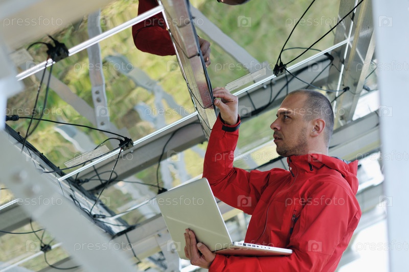 Молодой инженер проверяет исправность работы солнечных панелей