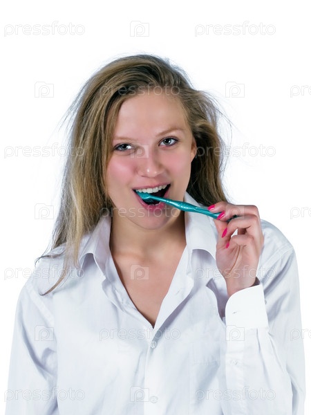 Портрет беспокойной молодой женщины, чистившей зубы