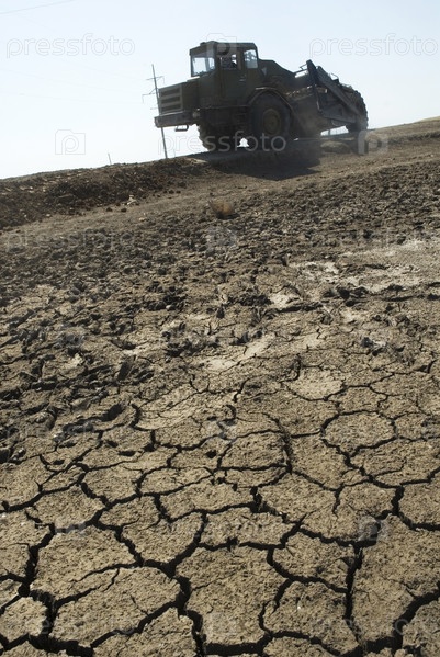 Разломалась земля на фоне трактора, который копает канал для воды в районе Алгайского района Саратовской области