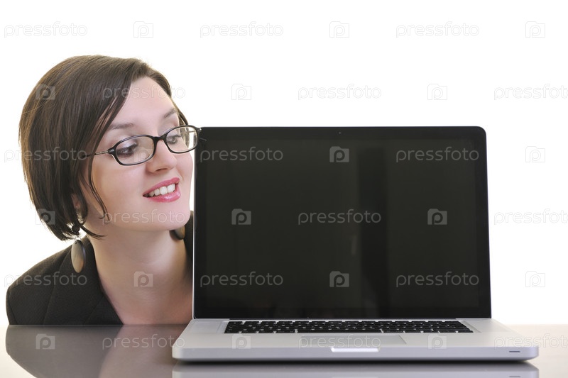 Молодая деловая леди с ноутбуком, изолирована на белом фоне