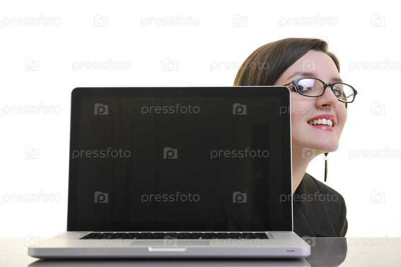 Молодая деловая леди с ноутбуком, изолирована на белом фоне