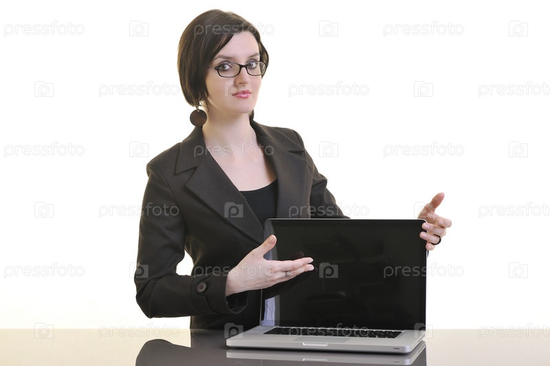 Молодая деловая леди с ноутбуком, изолирована на белом фоне