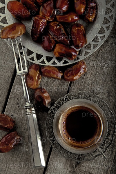 Сухофрукты с кофе на деревянном столе