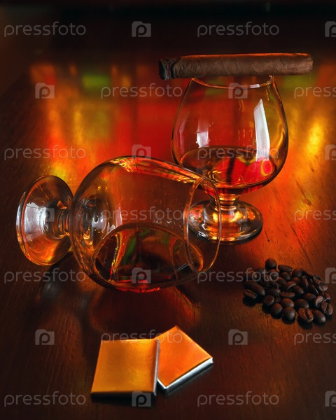 Самбука, кофейные зерна, шоколад и сигара на барной стойке