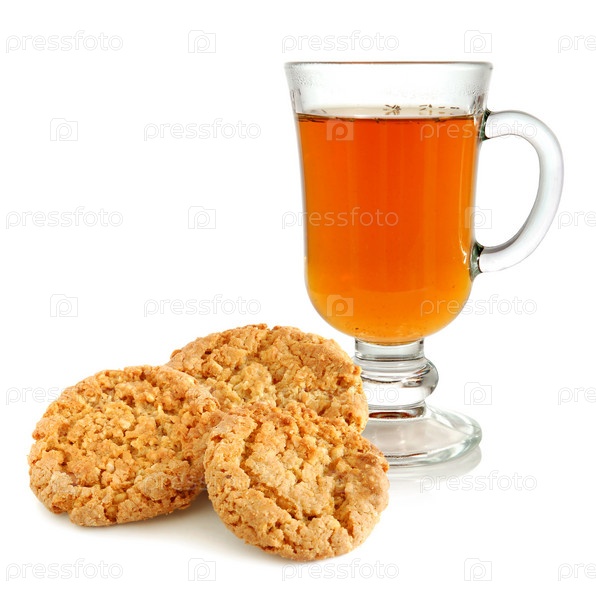 Домашнее овсяное печенье и чай на белом фоне