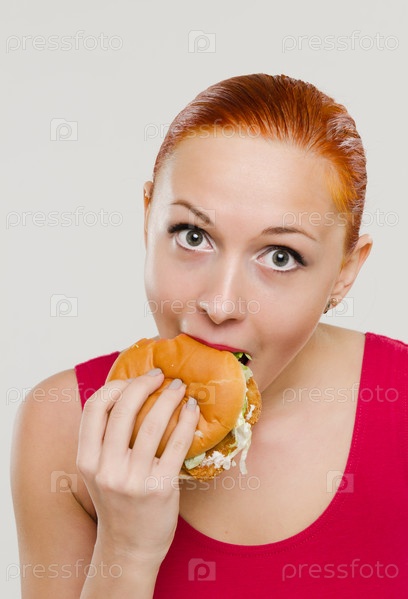 Красивая девушка ест сочный бургер