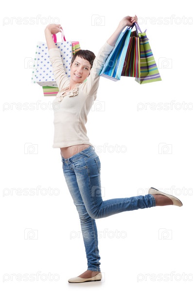 Девушка с бумажными пакетами на белом фоне