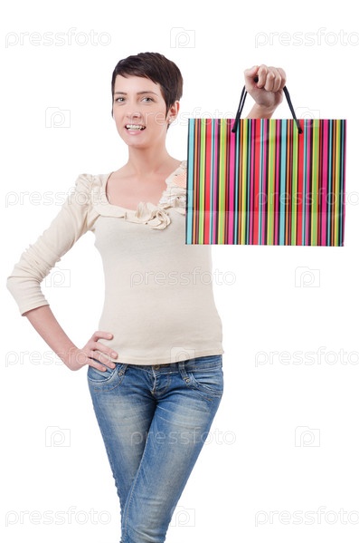 Девушка с бумажным пакетом на белом фоне