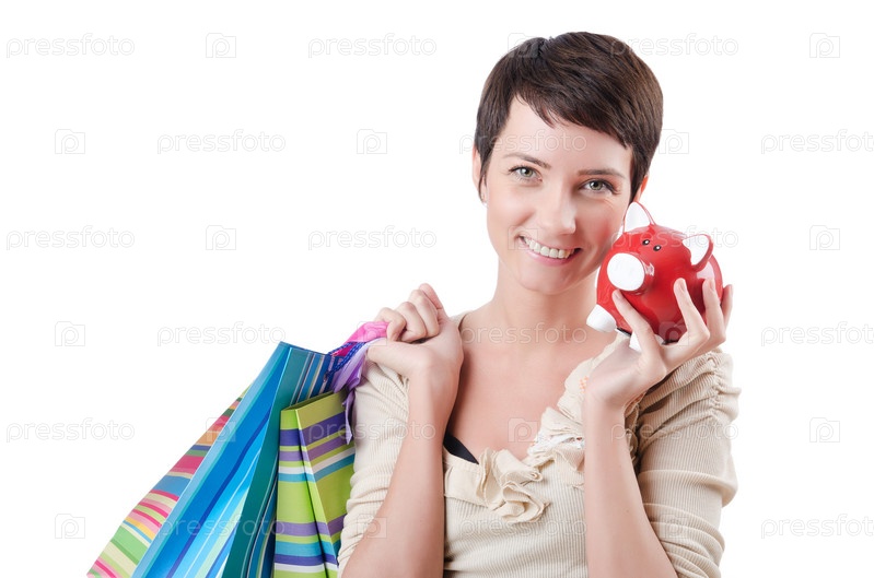 Девушка с бумажными пакетами и копилкой