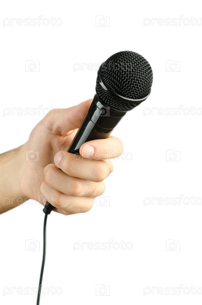 Рука с микрофоном на белом фоне
