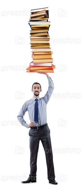 Предприниматель с книгами на белом фоне