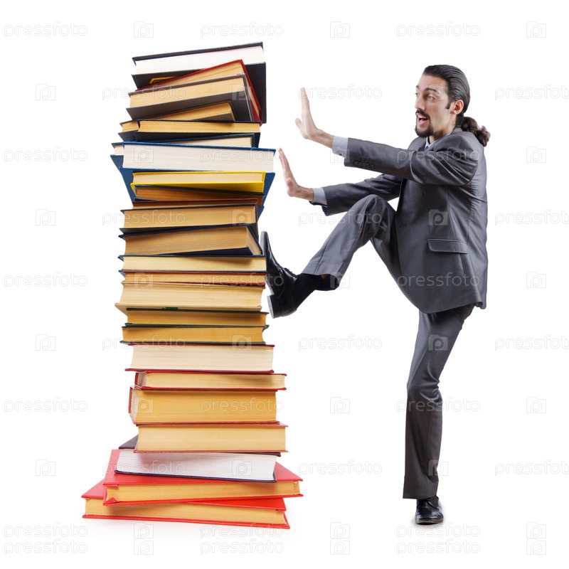 Предприниматель с книгами на белом фоне