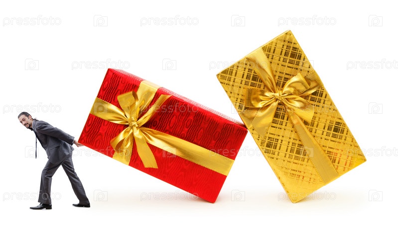 Предприниматель с подарочными коробки на белом фоне