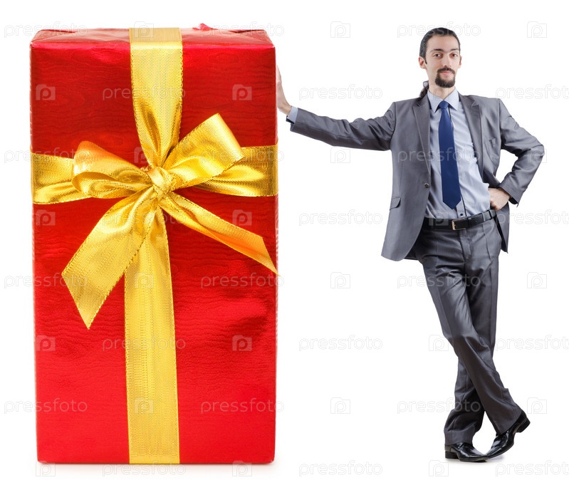 Предприниматель с большой подарочной коробкой на белом фоне