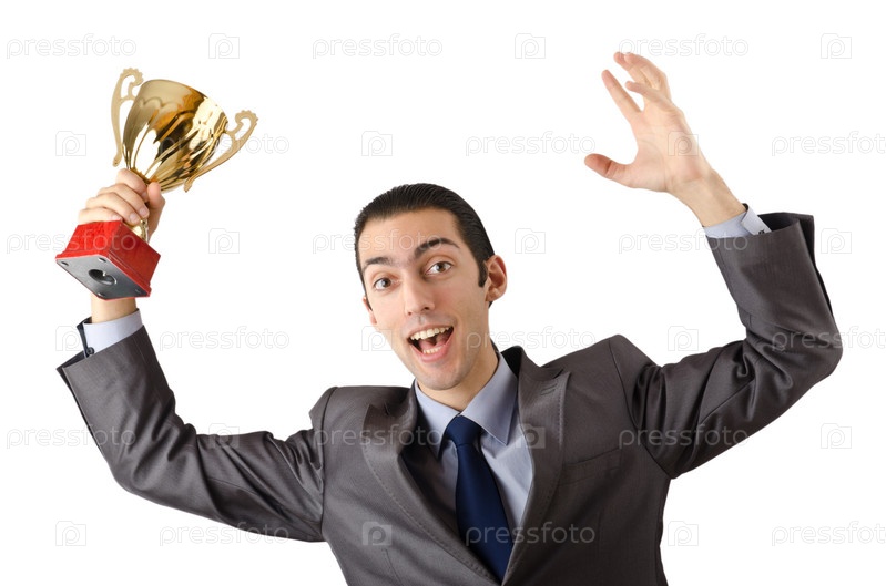 Эмоциональный бизнесмен с золотым кубком в руке