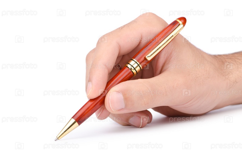 Ручка в мужской руке на белом фоне