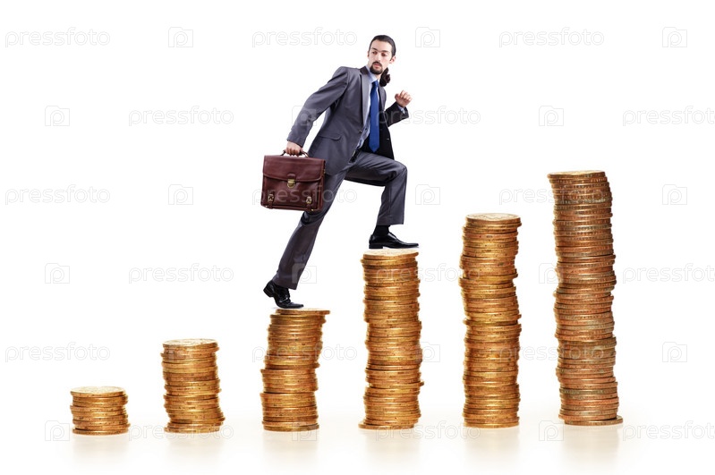 Бизнесмен поднимается вверх по стопкам из золотых монет