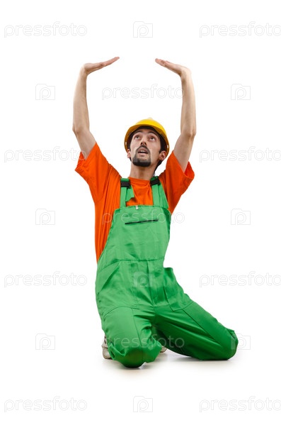 Мужчина-строитель в спецодежде на белом фоне