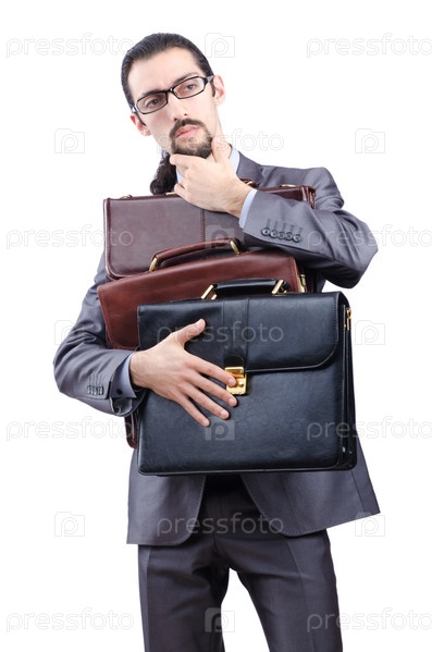 Предприниматель с тремя портфелями на белом фоне