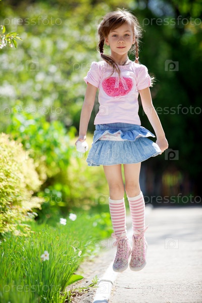 Портрет девочки в прыжке летом в парке