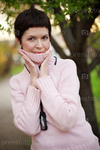 Портрет красивой женщины среднего возраста весной на открытом воздухе