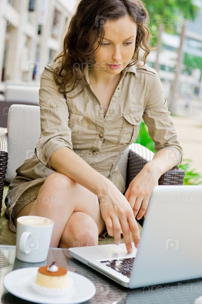 Молодая женщина в кафе с ноутбуком