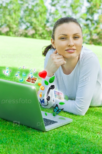 Молодая красивая женщина с ноутбуком на траве на открытом воздухе