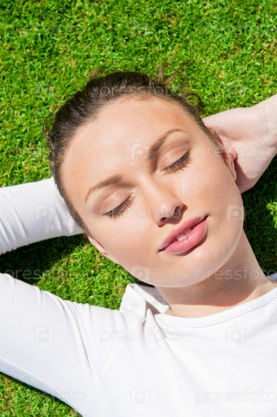 Молодая красивая женщина отдыхает на траве с закрытыми глазами