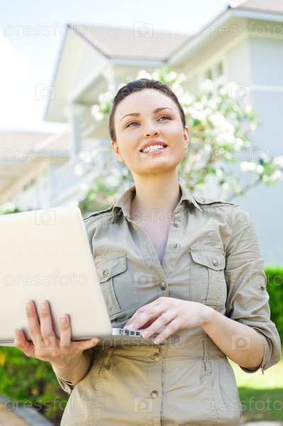 Молодая женщина-агент по недвижимости с ноутбуком в руках стоит возле красивого коттеджа