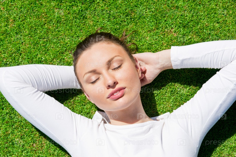Молодая красивая женщина отдыхает на траве с закрытыми глазами