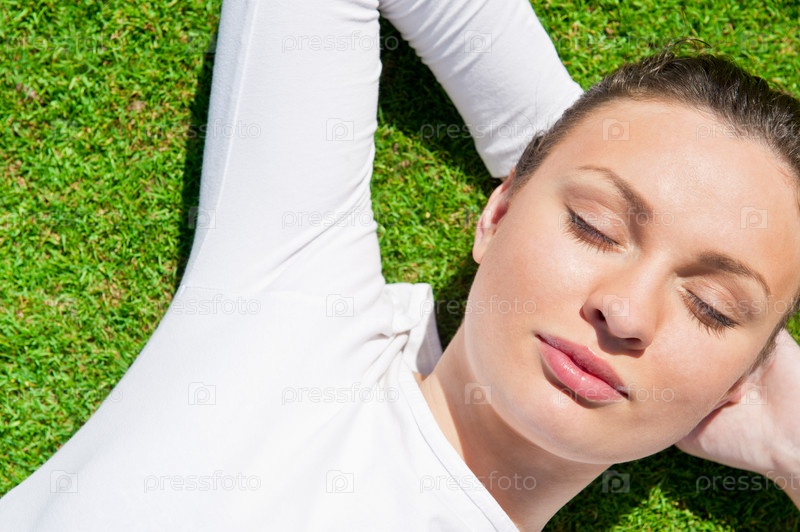 Молодая красивая женщина отдыхает на траве с закрытыми глазами