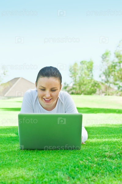 Молодая красивая женщина с ноутбуком лежит на траве на открытом воздухе