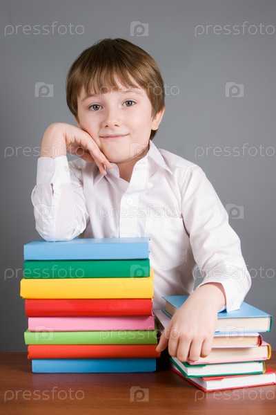 Мальчик с книгами на сером фоне