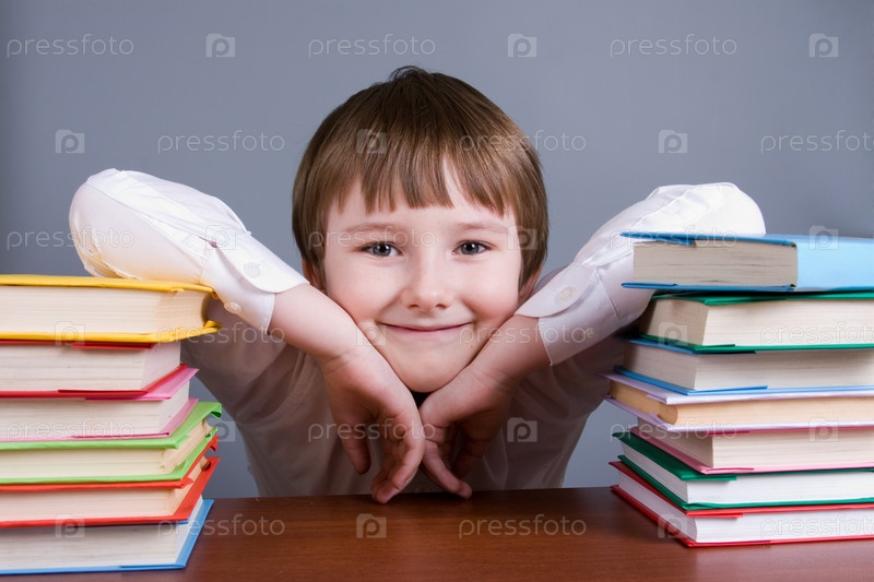 Улыбающийся мальчик со стопкой книг на сером фоне