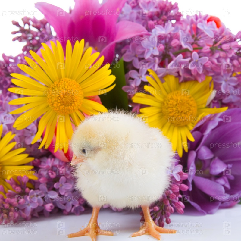 Цыпленок с букетом цветов на белом фоне