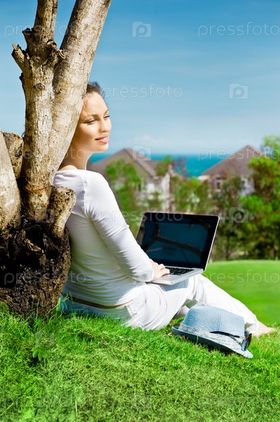 Молодая женщина сидит под деревом с ноутбуком в солнечный летний день