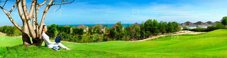 Молодая женщина сидит под деревом с ноутбуком в солнечный летний день