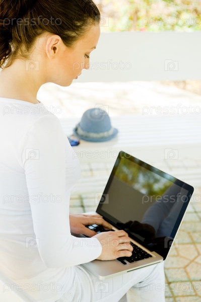 Молодая красивая женщина с ноутбуком сидит на скамейке в парке