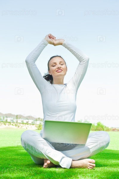 Молодая красивая женщина с ноутбуком сидит на траве в парке