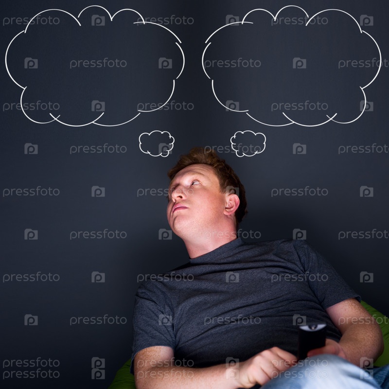 Портрет молодого человека с телевизионным пультом витающего в облаках