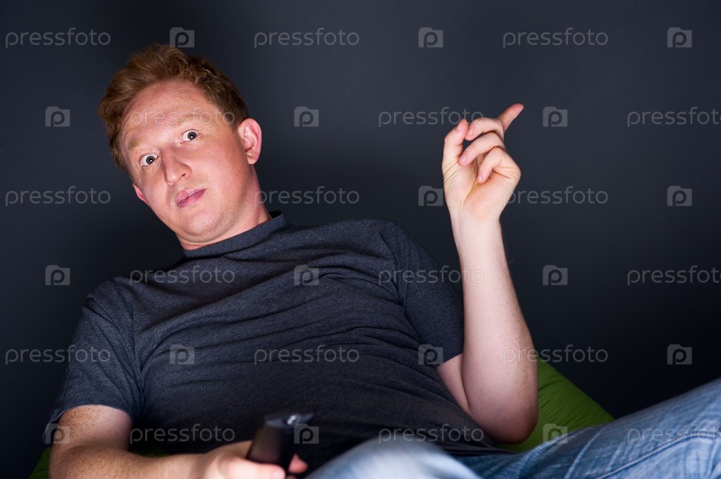 Молодой парень с пультом дистанционного управления смотрит телевизор