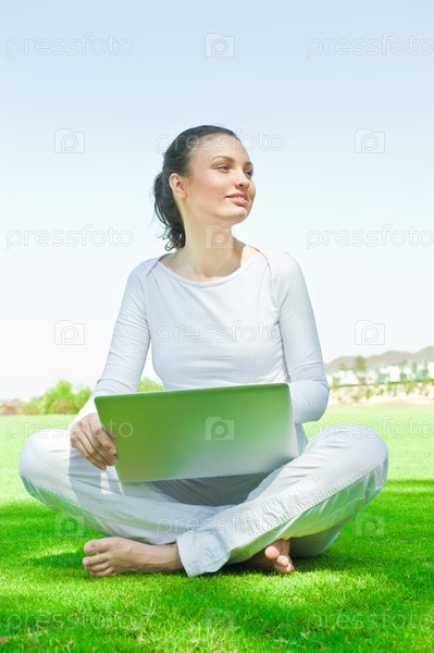 Студентка сидит на траве с ноутбуком в кампусе