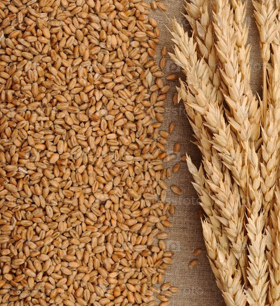 Зерна и колосья пшеницы на мешковине