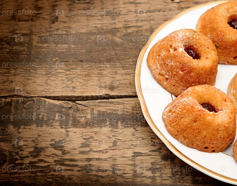 Кексы с цукатами и вишней на белой тарелке на деревянном столе