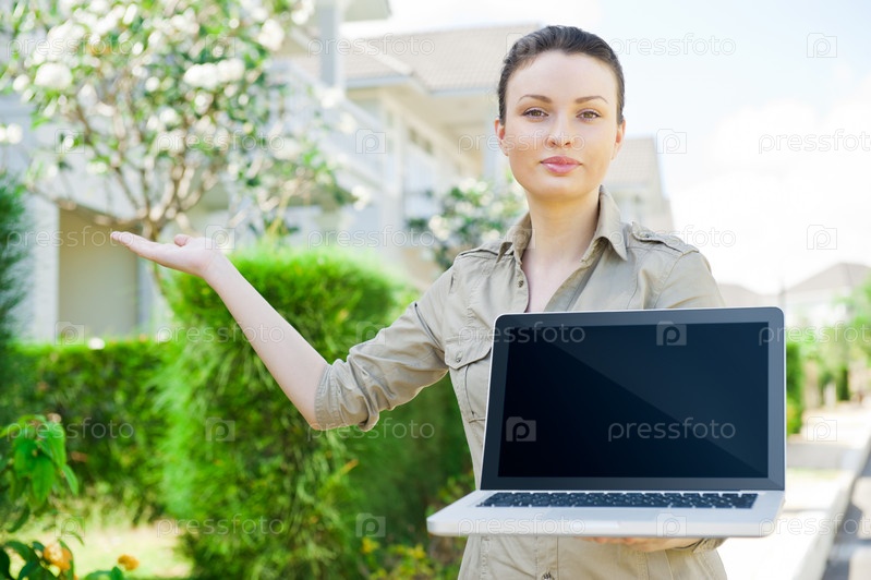 Молодая женщина-риэлтор с ноутбуком презентует коттедж