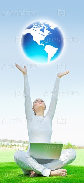 Молодая женщина с ноутбуком сидит на траве и протягивает руки к небу
