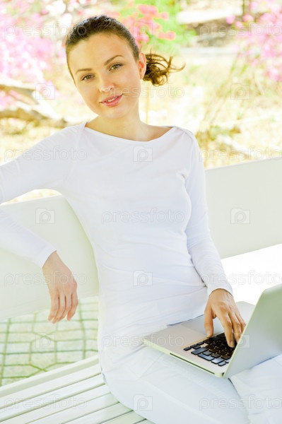 Молодая красивая женщина с ноутбуком сидит на скамейке в парке