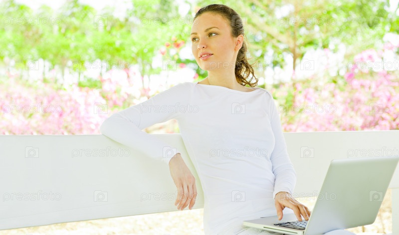 Молодая красивая женщина с ноутбуком сидит на скамейке в парке