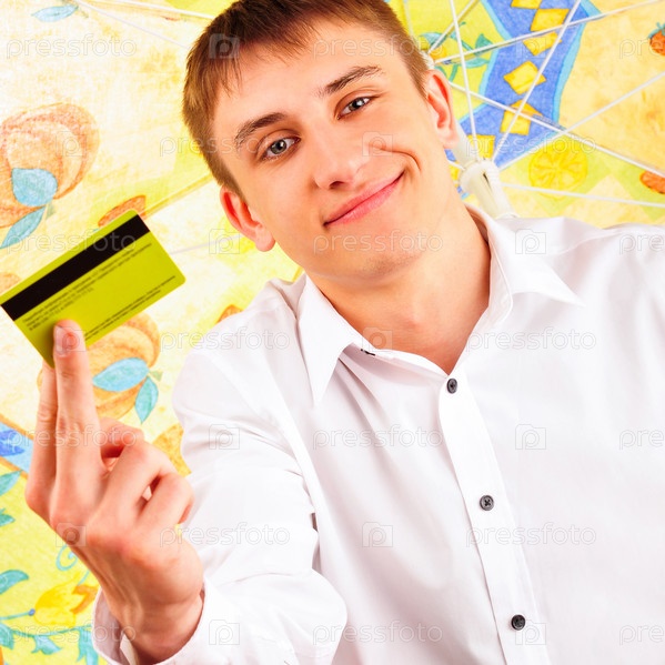 Портрет предпринимателя под зонтиком на пляже с кредитной картой в руке