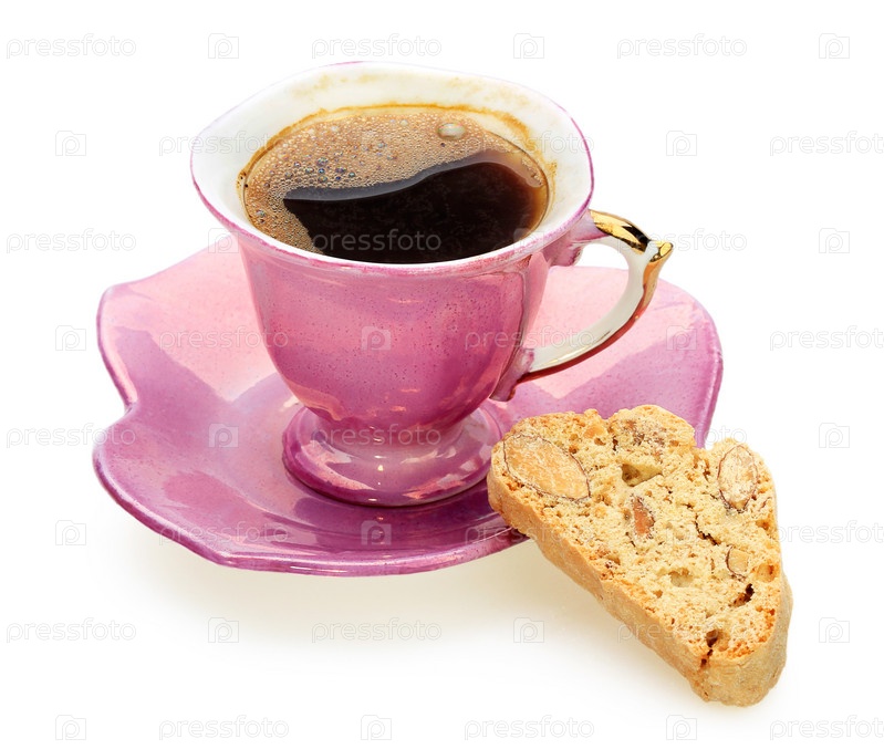 Керамическая кружка с кофе и хрустящий тост с миндалем на белом фоне